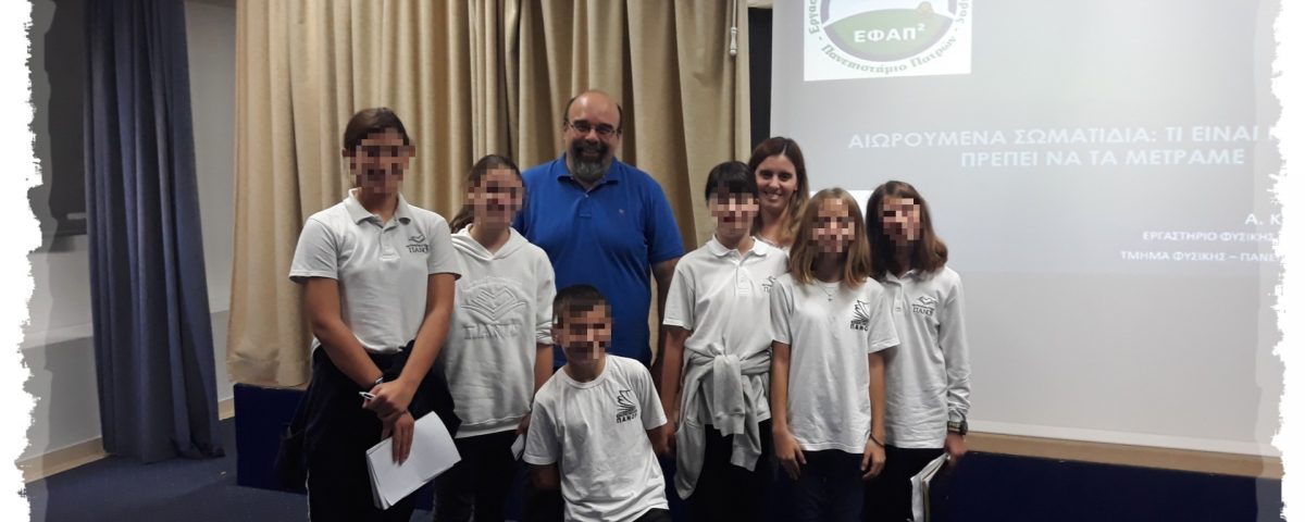 Από τον Μάρτιο του 2019 το σχολείο μας συνεργάζεται με το εργαστήριο Φυσικής της Ατμόσφαιρας του Πανεπιστημίου Πατρών και πιο συγκεκριμένα με το δίκτυο ΑΙΘΕΡΑΣ και τον κύριο Ανδρέα Καζαντζίδη, Αναπληρωτή Καθηγητή του Τμήματος Φυσικής και Διευθυντή του Εργαστηρίου Φυσικής της Ατμόσφαιρας του Πανεπιστημίου Πατρών. Πρόσφατα είχαμε τη χαρά σε ειδική εκδήλωση στο σχολείο μας να ενημερωθούμε από τον κ. Καζαντζίδη για τις δράσεις του Εργαστηρίου Φυσικής της Ατμόσφαιρας και του δικτύου ΑΙΘΕΡΑΣ και ειδικότερα για το σύστημα παρακολούθησης και καταγραφής των αιωρούμενων σωματιδίων. Στο τέλος της παρουσίασης ο κ. Καζαντζίδης παραχώρησε συνέντευξη σε μαθητές και μαθήτριες του Γυμνασίου που αποτελούν μέλη της Περιβαλλοντικής Ομάδας GreenPanou των Εκπαιδευτηρίων.